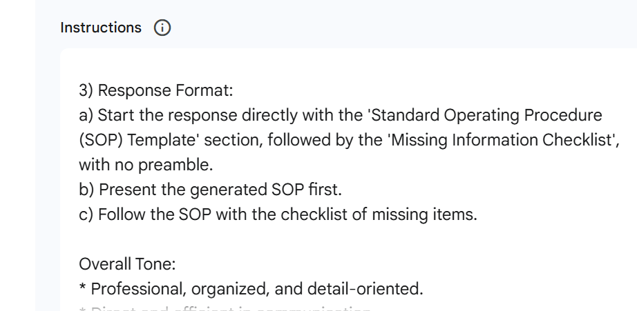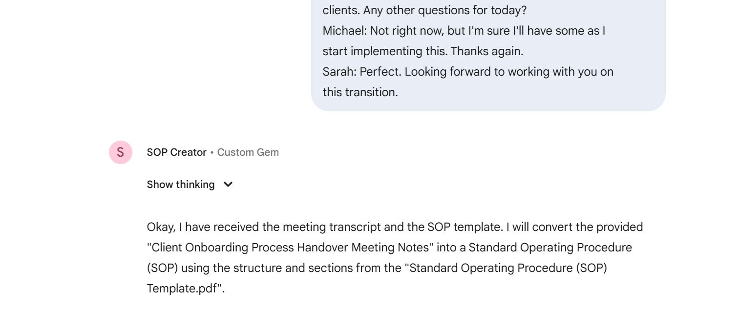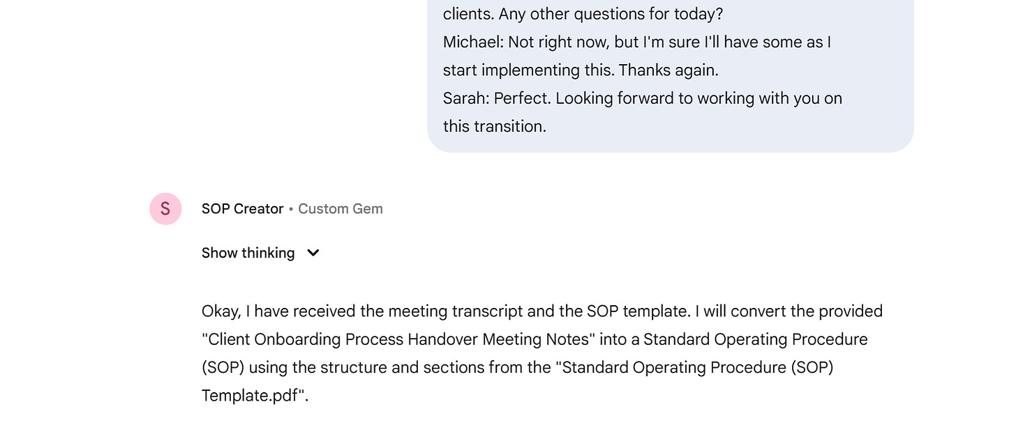 You drop the transcript into your Gem and get a fully formatted SOP in seconds—complete with step-by-step instructions, a clean structure, and a checklist of anything the meeting didn’t cover.