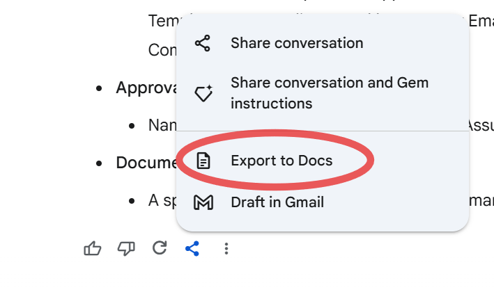 Use it anytime - From Gemini’s homepage, click SOP Creator in your side panel and upload a transcript. To quickly save the new SOP, click Share & Export → choose Export to Docs (no copy/paste required).