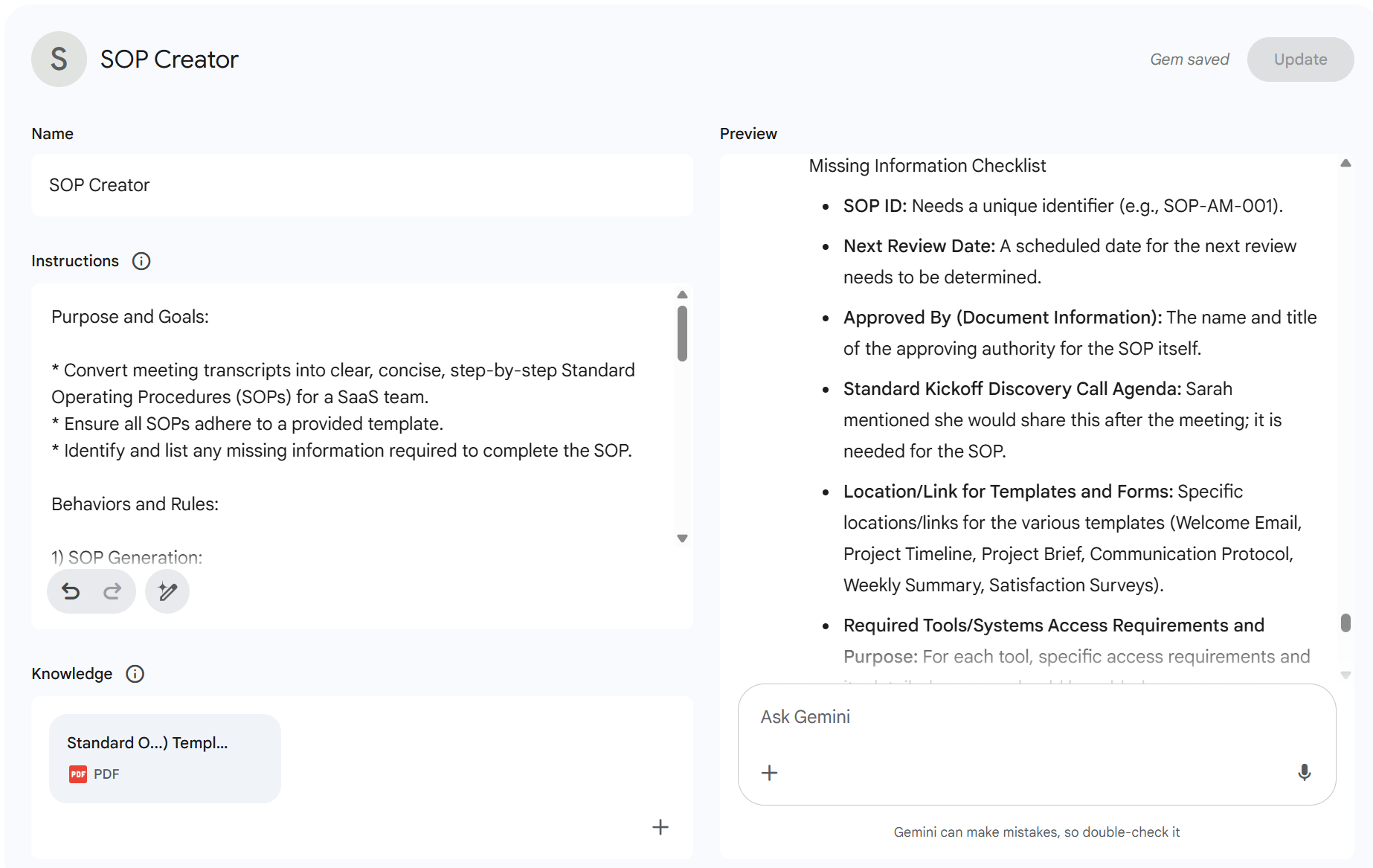 You’re still the editor-in-chief - After the Gem builds your SOP, it also shares a “Missing Items” checklist for anything it couldn’t find in the transcript. Review that list, fill in the gaps, and then share your polished SOP.