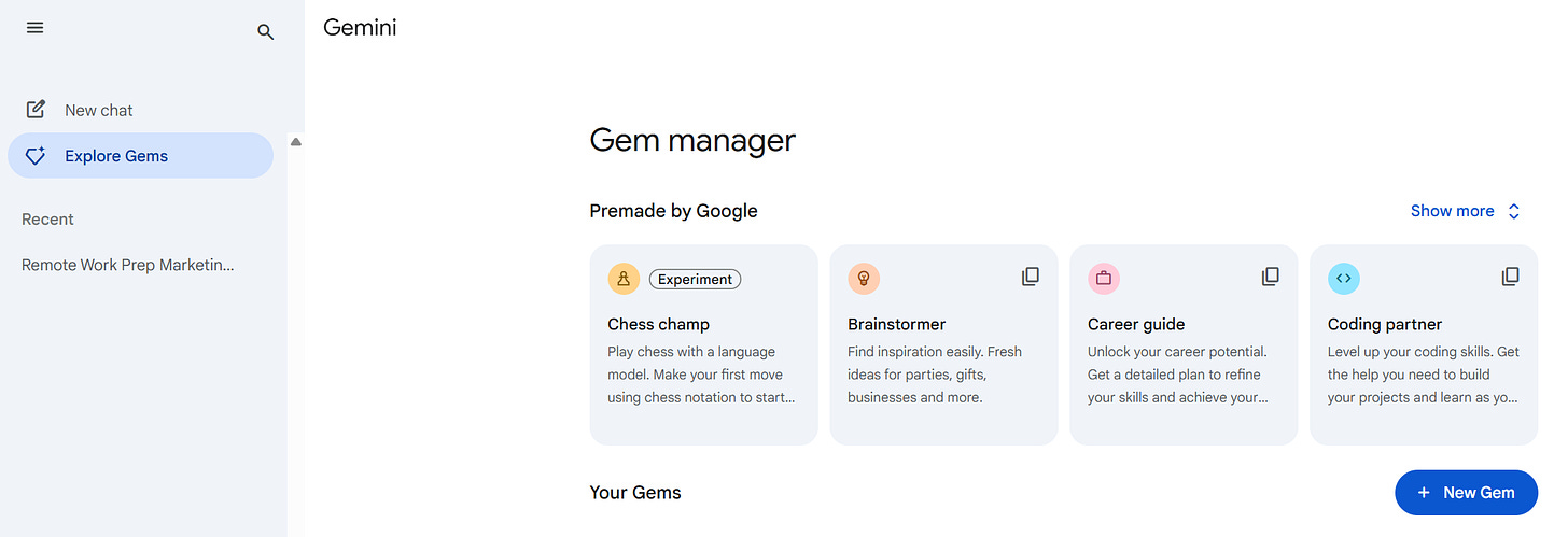 No true long-term memory - Every time you run the Gem in a new chat, it starts with a clean slate. It won’t recall previous chats unless you re-attach those docs or examples in the Knowledge section or Examples tab.