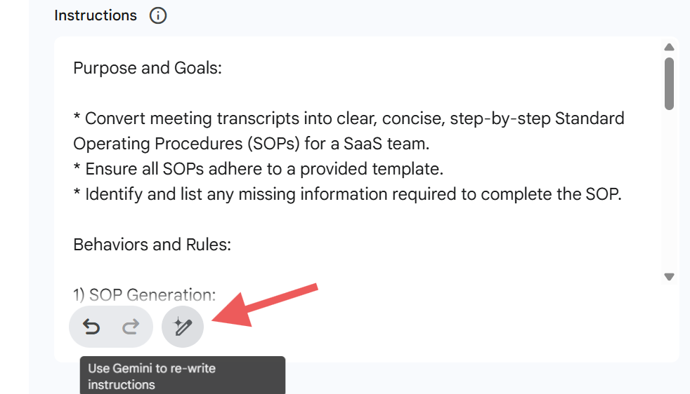 Upload your SOP template - In the “Knowledge” section, upload your SOP template (or you can use ours here). Gemini will use this structure to format the document
