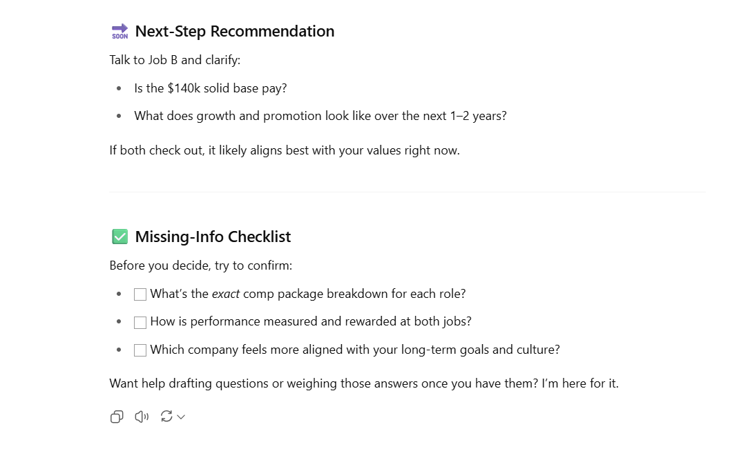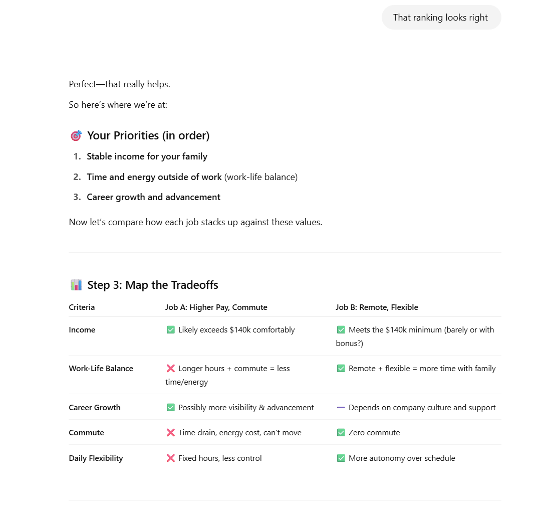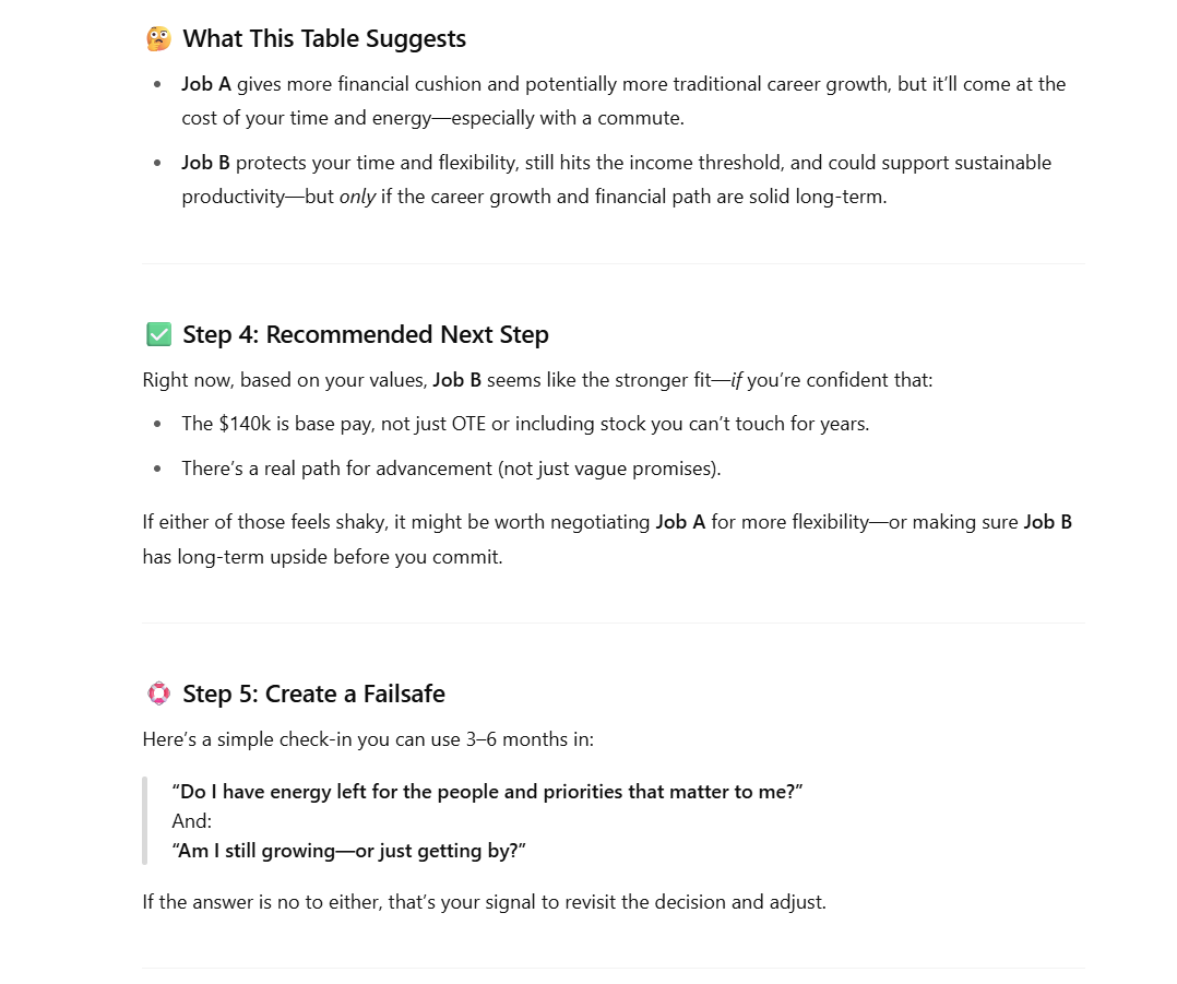 Get emotional: If the output feels vague, add emotional context like âI'm afraid Iâll burn out if I pick X.â