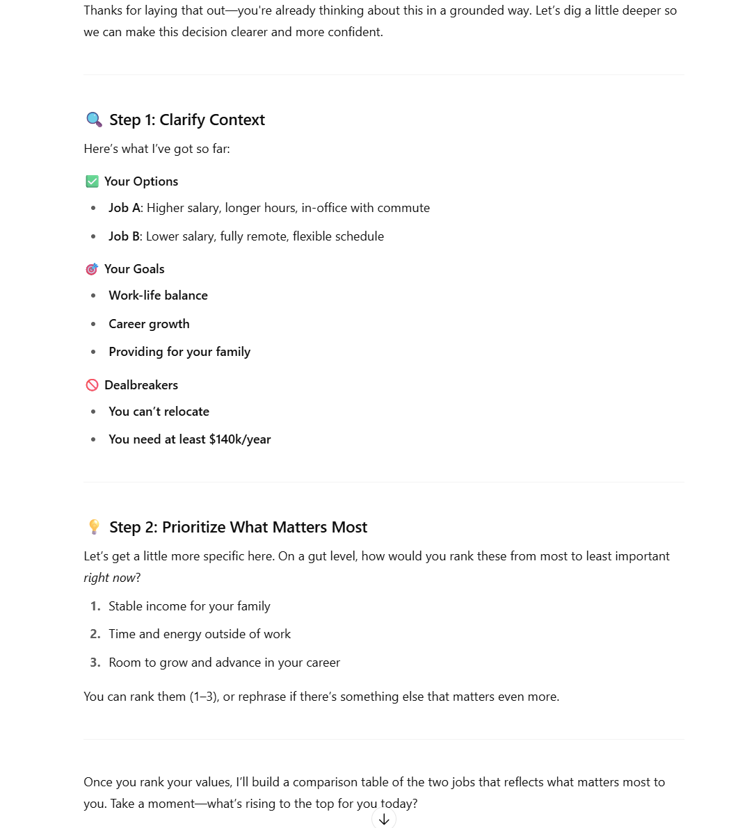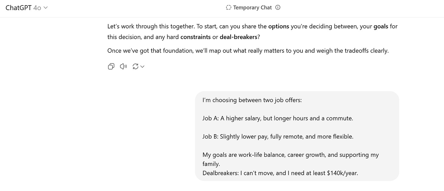 > âLetâs work through this together. To start, can you share the options you're deciding between, your goals for this decision, and any hard constraints or dealbreakers?â
