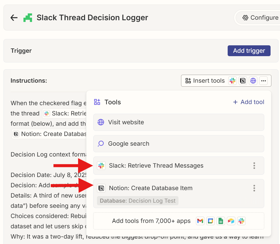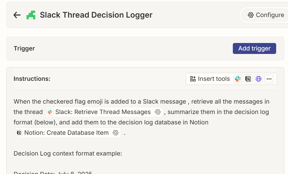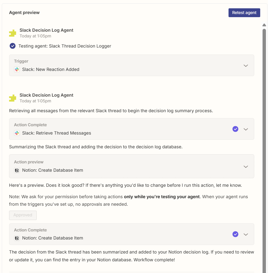 This recipe fixes that. In about 20 minutes, youâll use Zapierâs new Agents feature to turn one emoji reaction into a clean, searchable decision log in Notion. No copy-pasting. No Slack archaeology. Just one-click documentation.
