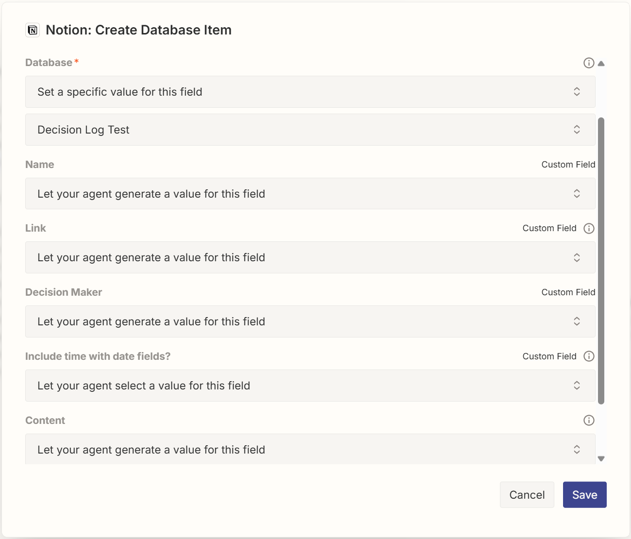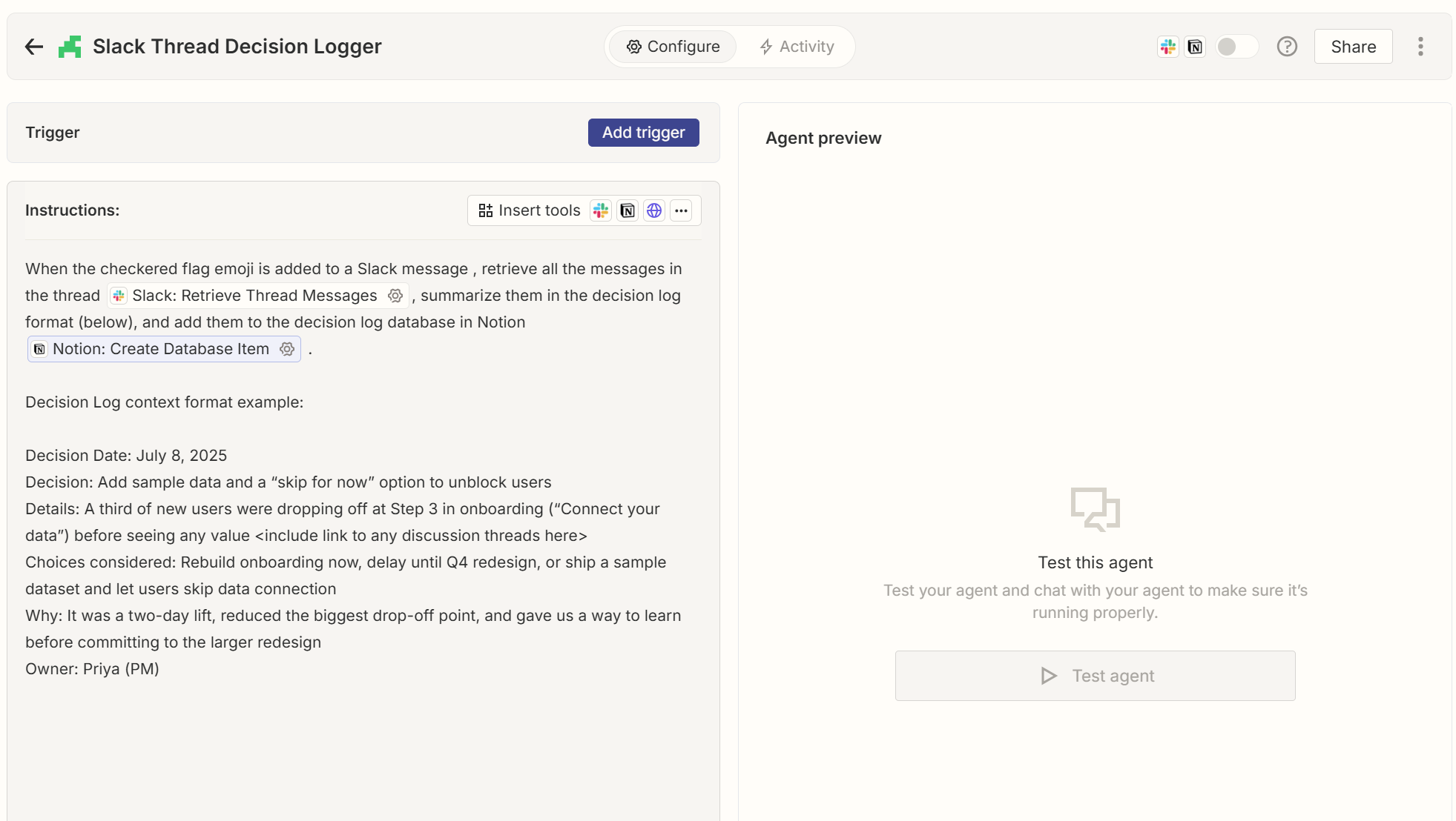 Test the Behavior - Add a test emoji to a past Slack thread, then select Test Agent. Review the database entry to check how well it identifies the decision and context.