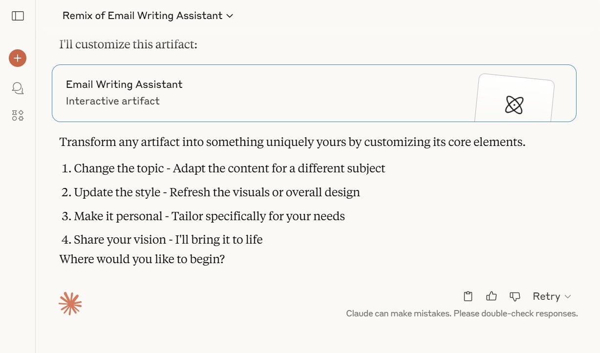 Iterate with follow-up prompts - Once your Artifact is built, you can make changes anytime. Ask Claude to shorten the responses, change button sizes, update labels, or adjust the tone. It will remember what you’ve already built and improve it step by step.