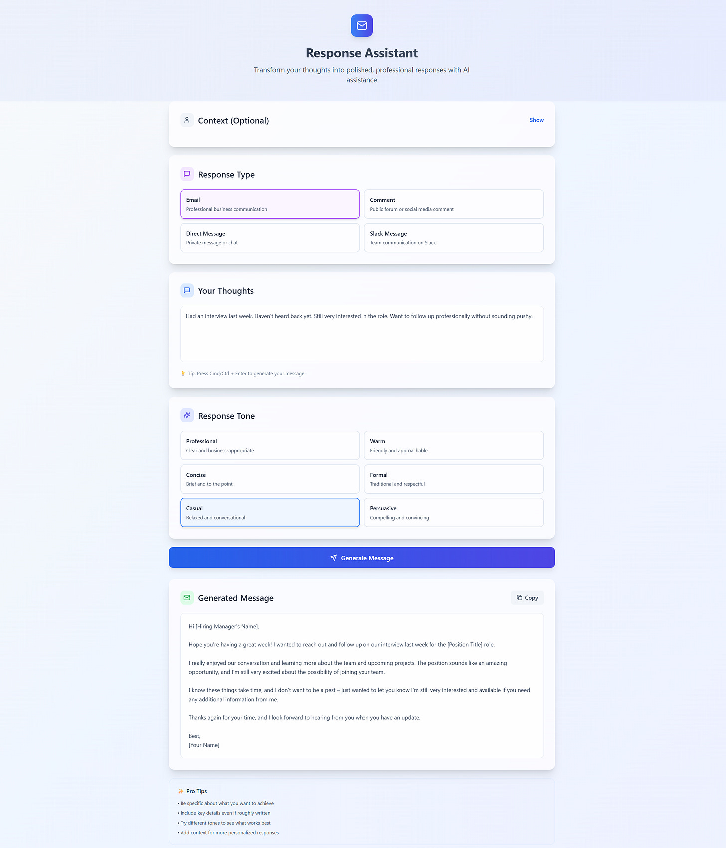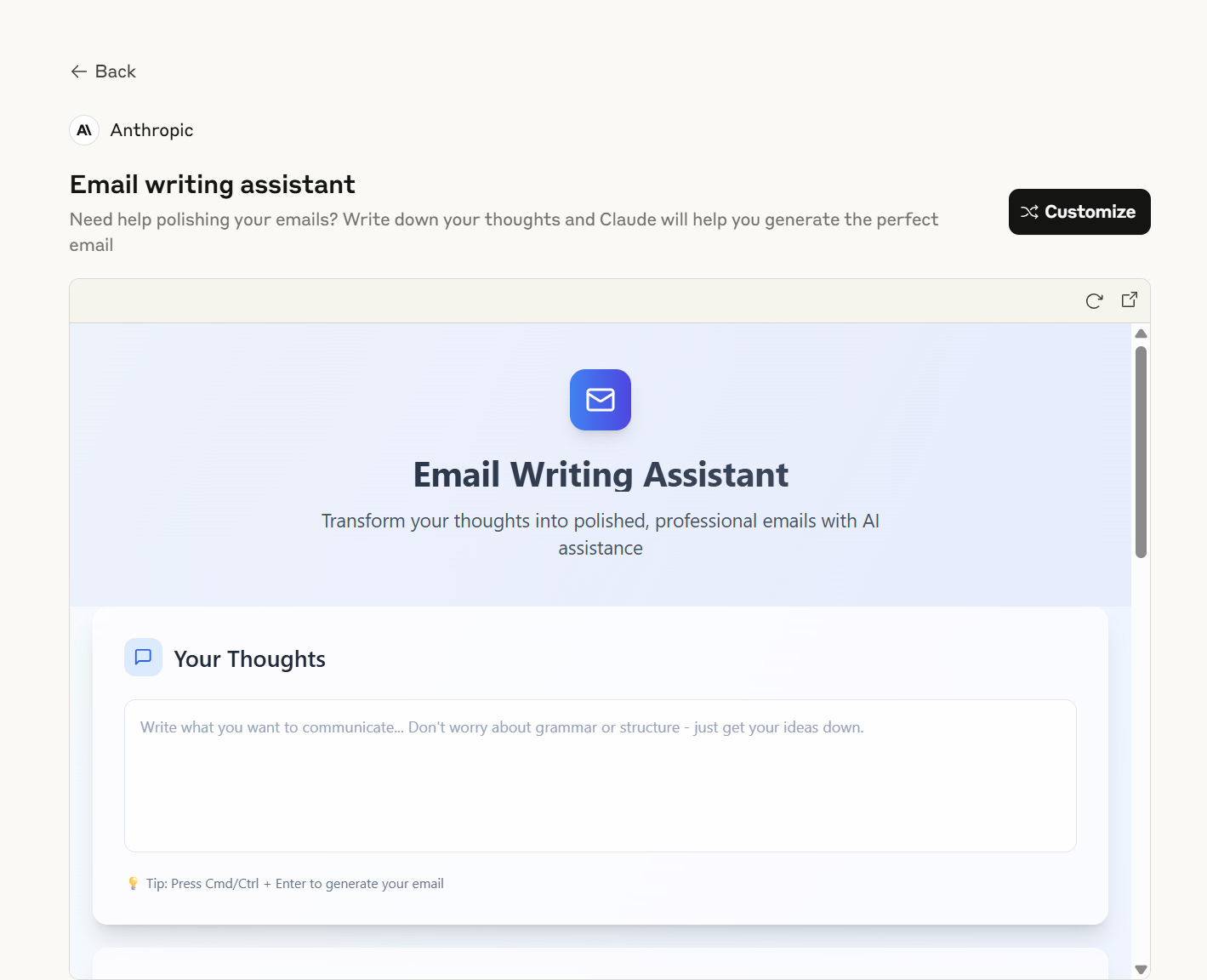 Skip the setup and start writing with the Artifact I’ve already created for you. Just choose your communication type and tone, enter your thoughts, and it will generate a polished reply for you automatically.