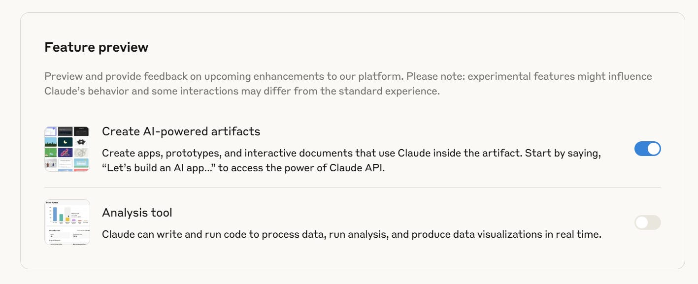 Enable built-in AI without the tech setup - Go to Settings → Profile and turn on Create AI-powered Artifacts. This lets you ask Claude to power the logic inside your tool, without needing to set up APIs or write any code.