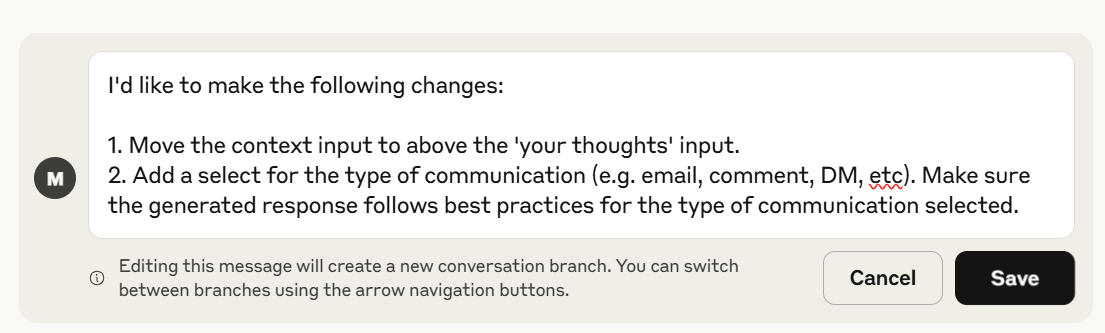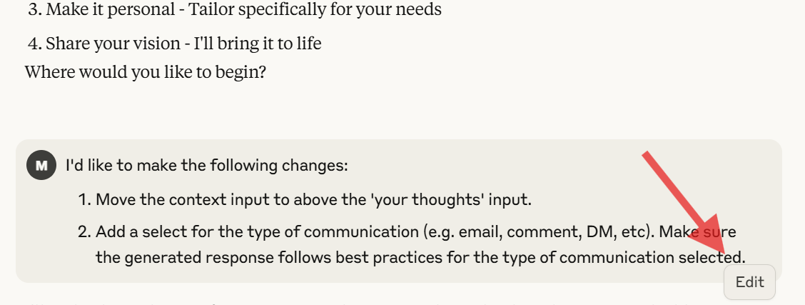 Try different versions without losing progress - Click “Edit” on an earlier message to branch into a new direction. This is a simple way to test different layouts or ideas without starting over. You can always return to the original.